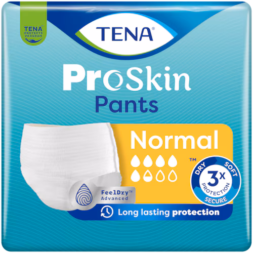 Majtki chłonne TENA Pants ProSkin Normal oferują do 100 % zabezpieczenia w średnim i ciężkim stopniu nietrzymania moczu, zapewniając 2 razy szybszą chłonność* oraz długotrwałe uczucie suchości w ciągu dnia i nocy. Jednorazowe majtki na nietrzymanie moczu, stworzone z myślą o kobietach i mężczyznach preferujących aktywny styl życia na co dzień.